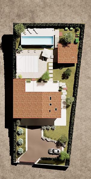 L’aménagement extérieur de la Villa Argia met en scène l’équilibre entre architecture et paysage : terrasses fluides, façades ouvertes sur la lumière, piscine à débordement intégrée dans la pente et pool house tourné vers l’horizon.